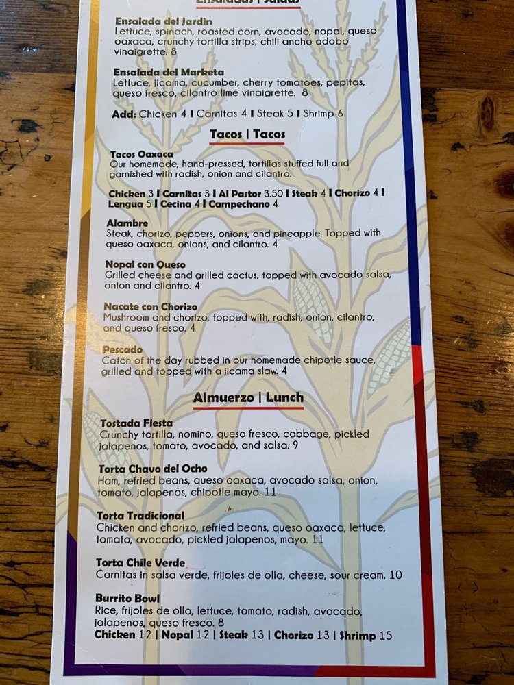 A giant crispy-crunchy corn shell covered with nomino (black bean spread), topped with grilled, steak, chorizo, and cecina and finished off with lettuce, fresh pulled queso Oaxaca (Mexican string cheese), tomato, and onion. Truly Oaxaca.