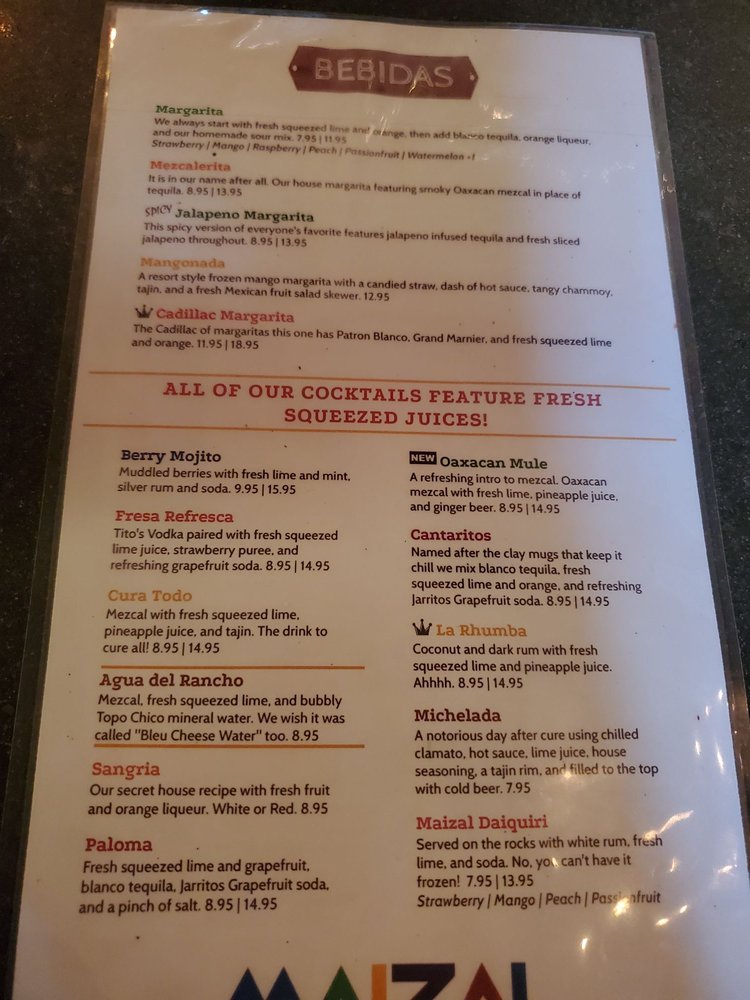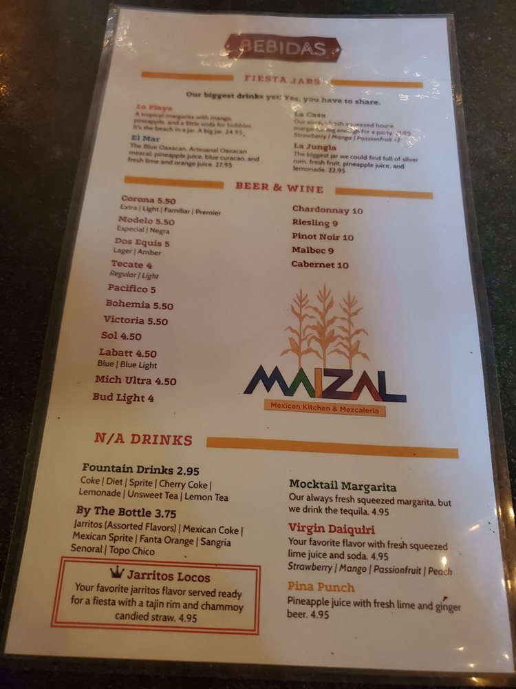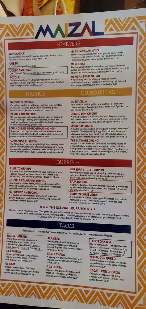 Introducing the menu at Maizal Mexican Kitchen, a hidden gem in East Amherst, NY. This trendy and classy Mexican restaurant offers a plethora of vegan and vegetarian options, making it a great choice for groups, kids, or a romantic dinner. The extensive menu features traditional Mexican dishes like flavorful chicken quesadillas, authentic street tacos, and delectable churros. Customers rave about the generous portions, fresh ingredients, and friendly service. The vibrant ambiance, complete with free Wi-Fi and a full bar, sets the perfect backdrop for a memorable dining experience. Don't miss out on their exceptional Mezcal and tequila selection, ensuring a unique and delicious culinary adventure at Maizal Mexican Kitchen.